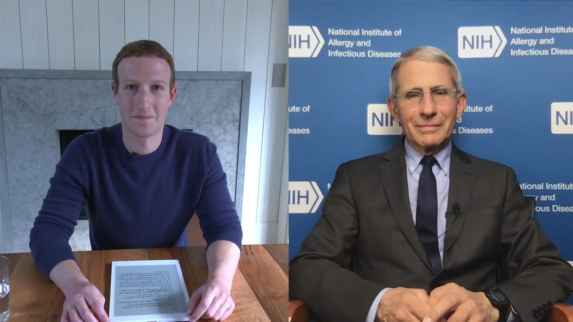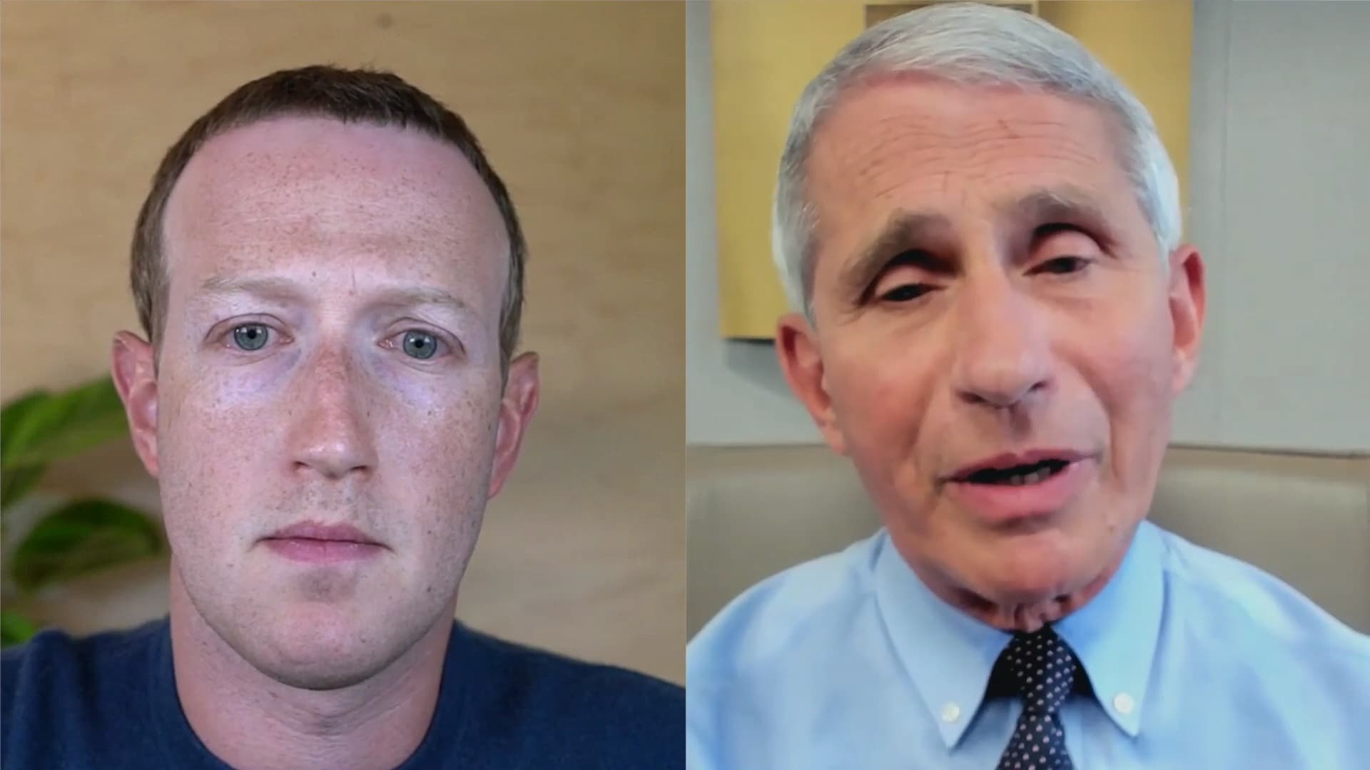 Mark Zuckerberg talks COVID-19 with Dr. Fauci, director of the National Institute of Allergy and Infectious Diseases.